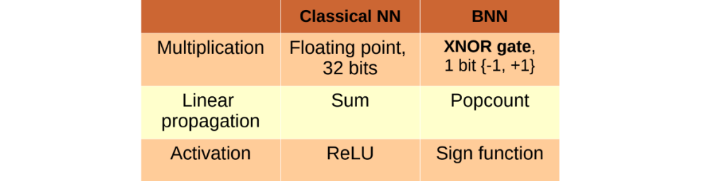 Knowing what a (real-weight) neural network is you already have the most essential information. In contrast, a binarized neural network (BNN) has its weights and activations limited to a single bit precision. Meaning that those have values of either +1 or −1 . Below is a comparison table.